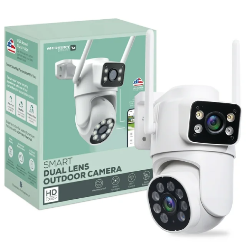 We present you the Merkury Smart Dual Lens Outdoor security camera, which provides extraordinary image quality in 1080p HD format. This camera is equipped with two lenses, which allows you to cover a larger area and provides a detailed image even in the dark thanks to the built-in infrared backlight. Thanks to the function of two-sided audio, you can communicate with visitors or scare away uninvited guests without leaving home. An intuitive mobile app allows you to control the camera in real time, get traffic alerts and watch recorded videos. A waterproof housing guarantees reliability in all weather conditions, making this camera an ideal solution for protecting your property. Do not miss the opportunity to ensure the safety of your home with Merkury Smart Dual Lens Outdoor Security Camera!